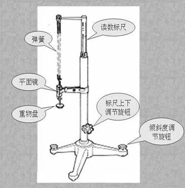 在装有水平调节螺丝的在足座上,竖直装一套筒,套筒顶端安装带有刻度的游标,筒内插入刻有毫米刻度尺的钢管,利用旋扭通过里面的滑轮,链条可以调节刻度钢管在套筒中升降,从而可以读出弹簧长度的变化。